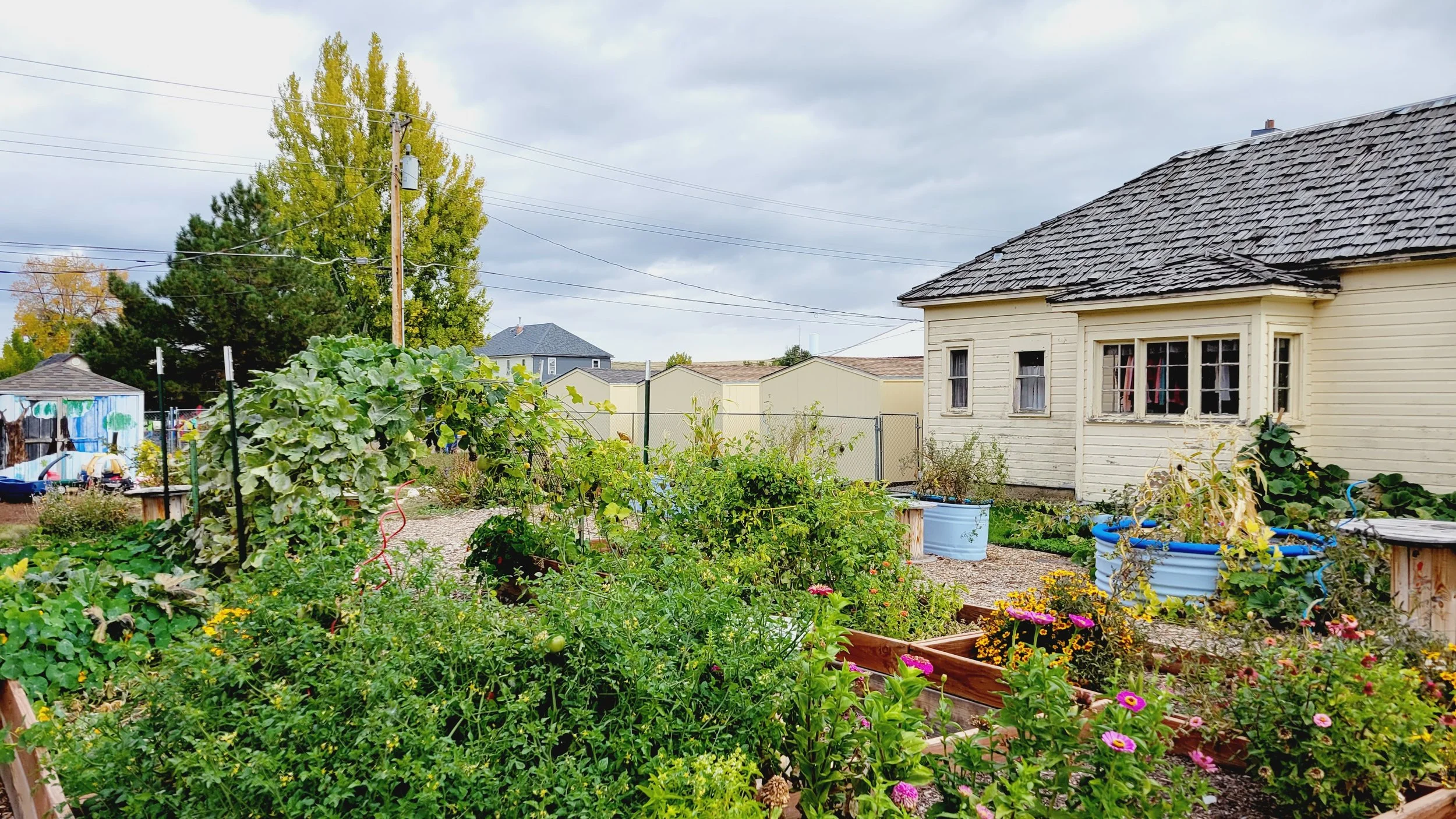 New fencing was added in 2024. This garden features raised beds, a pumpkin patch, raspberries, roses, and more!
